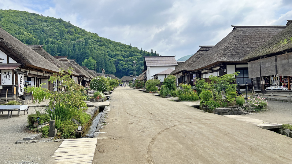 6/27 8:55 大内宿 500mに渡って道の両側に茅葺き屋根の建物が並ぶ。大半がお土産屋で、食堂や民宿も兼ねている所も多い。