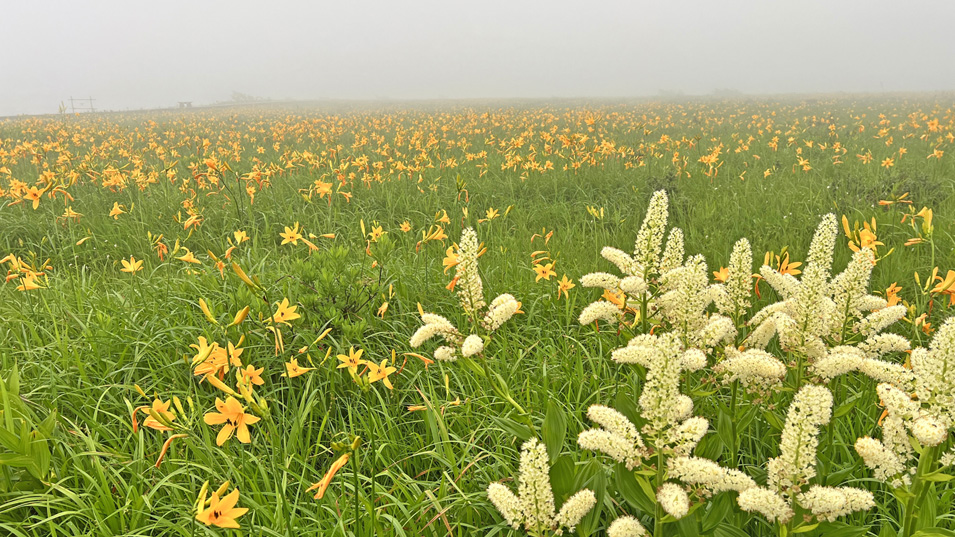 6/27 15:45 ニッコウキスゲとコバイケイソウ ニッコウキスゲのピーク時にはコバイケイは枯れている事が多いので、両方見られるのはラッキー。