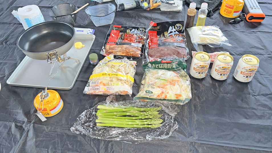 6/27 16:40 食材 メニューは焼き肉。牛カルビ、牛タン、野菜、焼きそば、アスパラ、ビール。