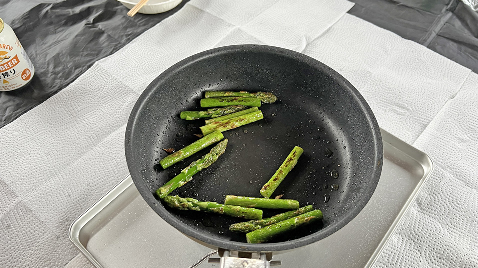 6/27 16:50 アスパラ まずはビールのおつまみ。アスパラ炒め、塩胡椒味。