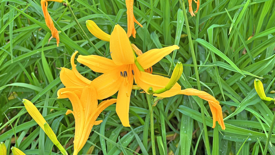 6/28 7:30 一日花 ニッコウキスゲは朝咲いて夜にはしぼんでしまう一日花。花言葉は「日々あらたに」。