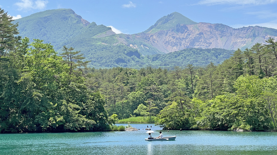 6/28 11:05 五色沼と磐梯山 美しい五色沼(毘沙門沼)と会津磐梯山。
