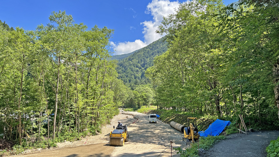 7/31 10:05 工事中 大雨でも流されないように管理用道路を造り直しているらしい。