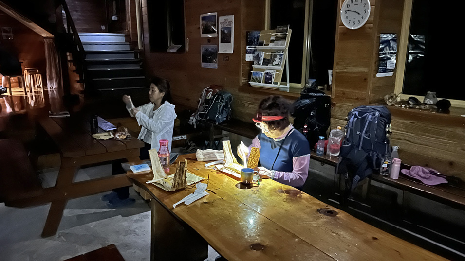 8/1 3:45 朝食 天気の良い午前中に登頂するため早起きして朝食弁当を食べる。