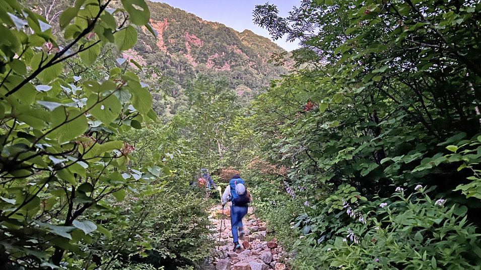 8/1 4:35 樹林帯 4:20薄暗い樹林帯をヘッデンを点けて出発したが、15分ほどで明るくなりヘッデン消灯。