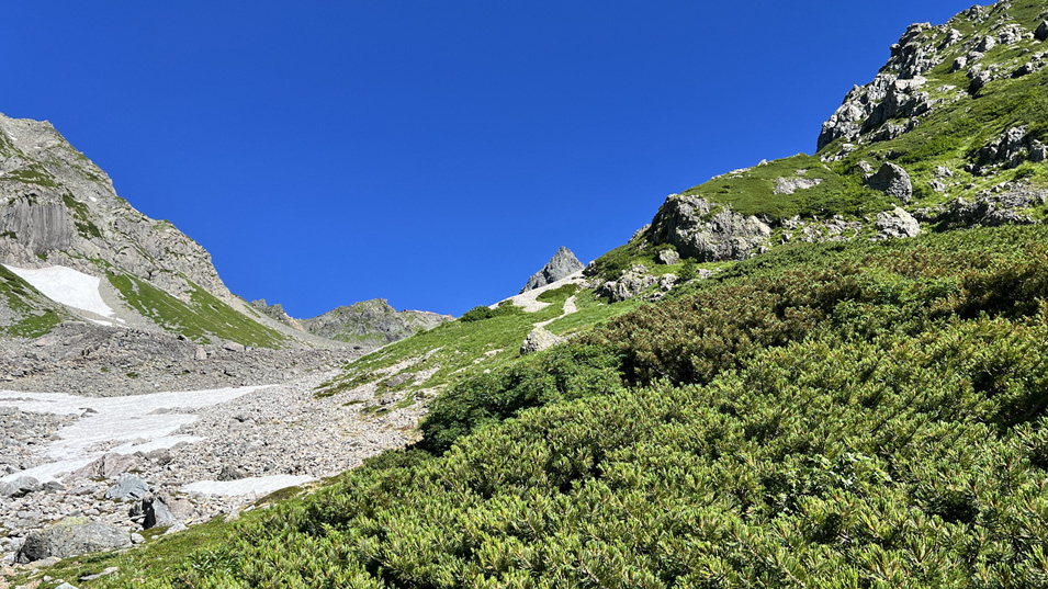 8/1 8:10 槍の穂先 約3時間登って漸く槍の穂先が見えたが、見えてからも長いのだ。