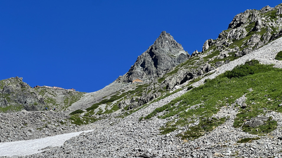 8/1 8:15 大槍 見え始めてから少し登ると大槍の全貌、槍ヶ岳山荘、殺生ヒュッテが見える。