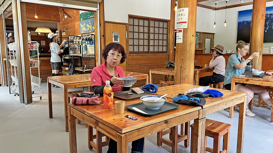 8/2 11:10 ランチ 晴天に油断をして横尾山荘でのんびりランチ。洋栄さんはうどん、私はラーメン。