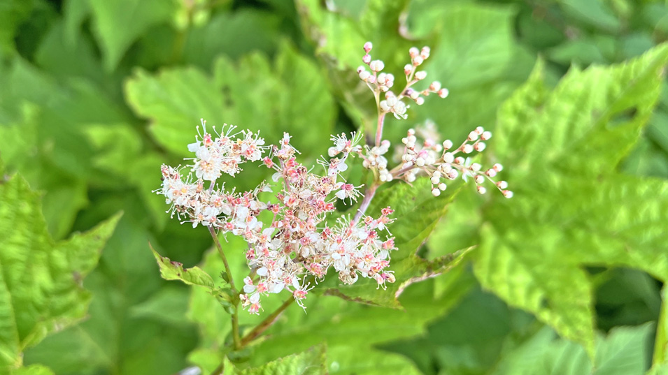 8/20 7:10 シモツケソウ 下野国(栃木県)で発見されたのが由来のシモツケソウ。花言葉は「純情」。