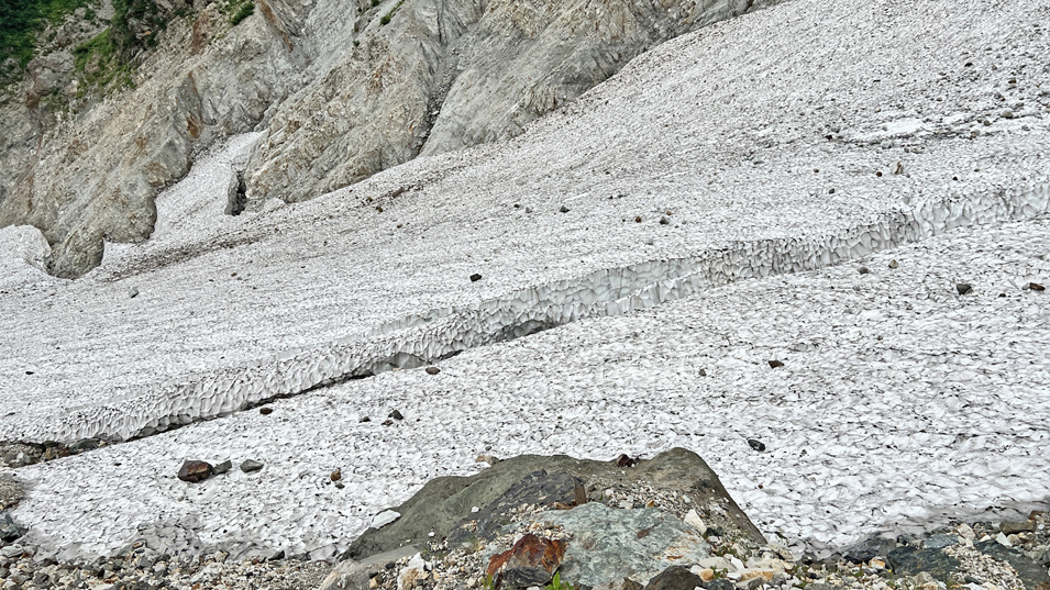 8/20 8:45 クレバス 秋道を15分ほど登った所から大きなクレバスが見えた。これでは雪渓は通れない。