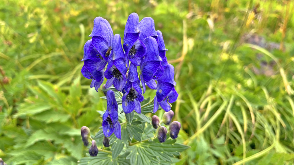 8/20 11:05 トリカブト 猛毒の鳥兜。根だけでなく花、葉、花粉にまで毒があり、経口摂取すると数時間で心臓が止まるそう。 花言葉は「人嫌い」「復讐」「騎士道」「栄光」。