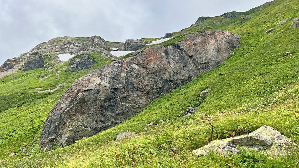 8/20 11:10 氷河の痕跡 岩に付いたスジは氷河に削られた痕跡なのだ。