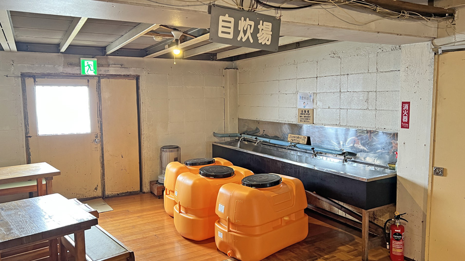 8/20 12:40 自炊場 食堂の手前にある自炊室。水タンクはこのあとすぐに無くなっていた。