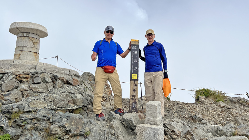 8/20 14:30 登頂 ガスで何も見えないが、9年ぶり6回目の登頂。後方の風景指示盤は1941(S16)年に富士山の強力・小宮山 正が背負って大雪渓を登り 山頂まで運んだもので、重量360kgを180kgの2ピースにして運んだものだ。とても信じられない。
