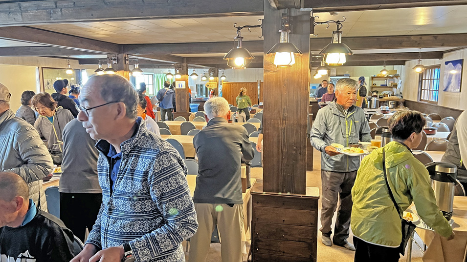 8/20 17:05 食堂全景 120席くらいある広い食堂。ご飯と味噌汁は各テーブルにあり、お代わり自由。