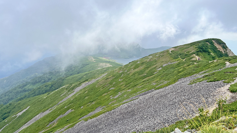 8/21 7:40 船越ノ頭 船越ノ頭で白馬大池が見えて来た。この頃から時々ガスが切れるようになった。
