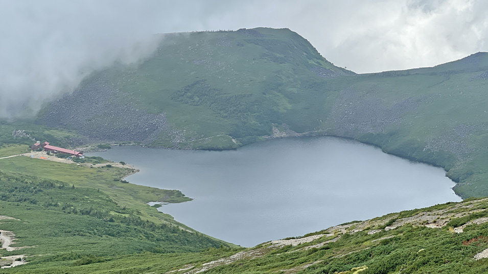 8/21 7:55 白馬大池 近づくにつれ次第に全体が見えてくる。標高2379mにある火山湖で、最大水深13.5m、周囲約1km。