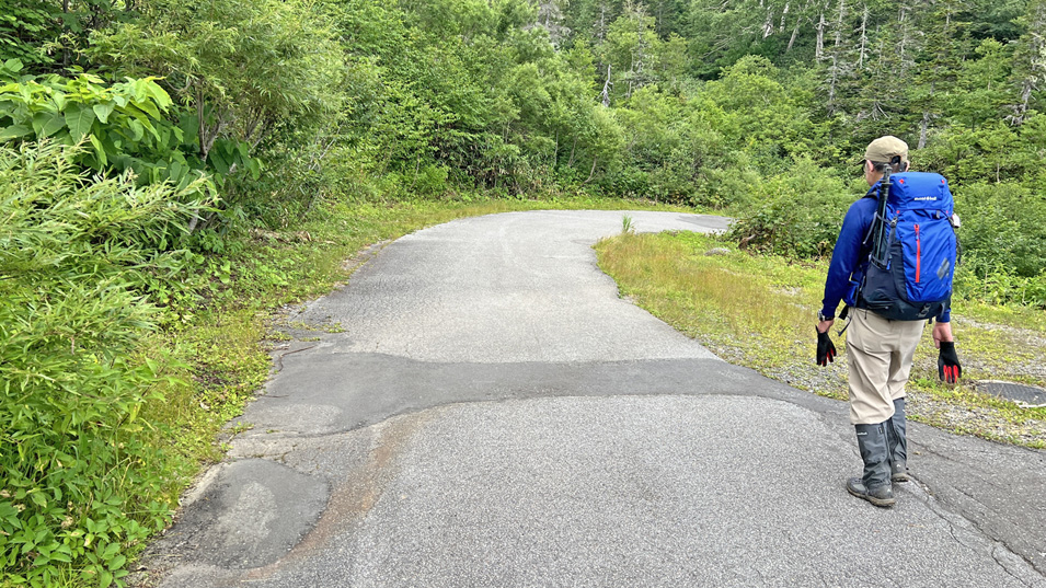 8/21 11:40 ロープウェイ駅へ ビジターセンターからロープウェイ駅まで500mの舗装道路歩き。