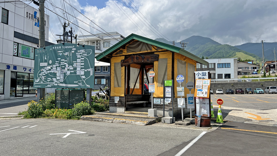 8/21 12:35 栂池バス停 ゴンドラ駅から坂道を下り、駐車場沿いに150mほど行った所に白馬・八方方面行きのバス停がある。