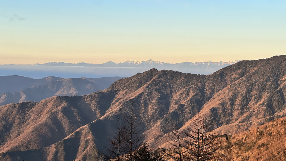 12/13 7:05 南アルプス 右から農鳥岳、塩見岳、荒川岳、赤石岳、聖岳。