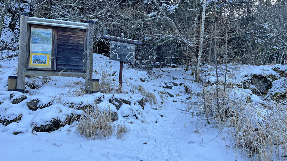 12/19 8:15 南沢分岐 行者小屋に通じる南沢ルートの入口。赤岳鉱泉には北沢ルートが最短。