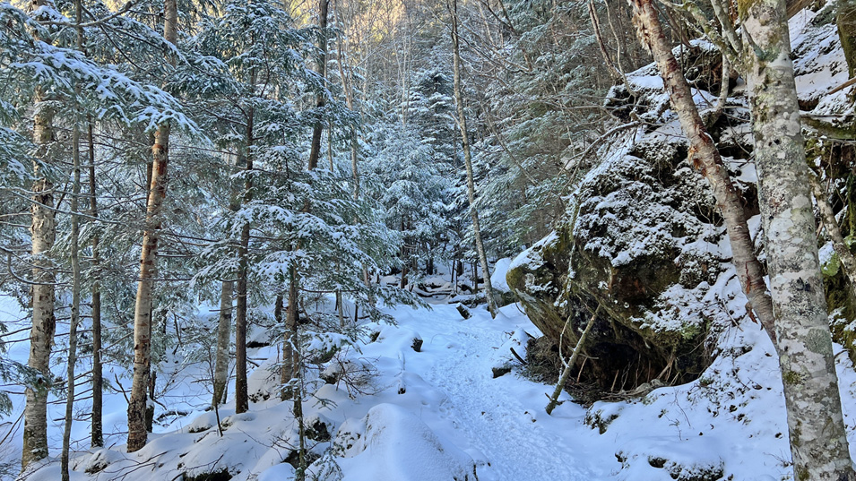 12/19 9:30 北沢ルート 堰堤広場から赤岳鉱泉までの積雪も5〜10cmと少ない。ここもチェーンスパイクで問題なし。