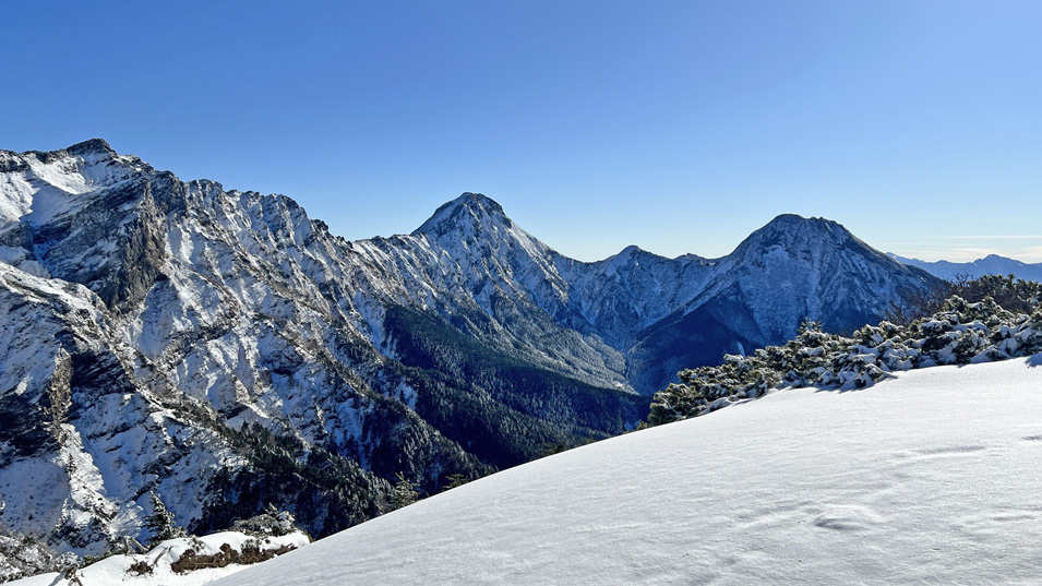12/19 13:35 横岳、赤岳、中岳、阿弥陀岳 この時間になってもガスもなく霞みもしない。今日はラッキーだ!