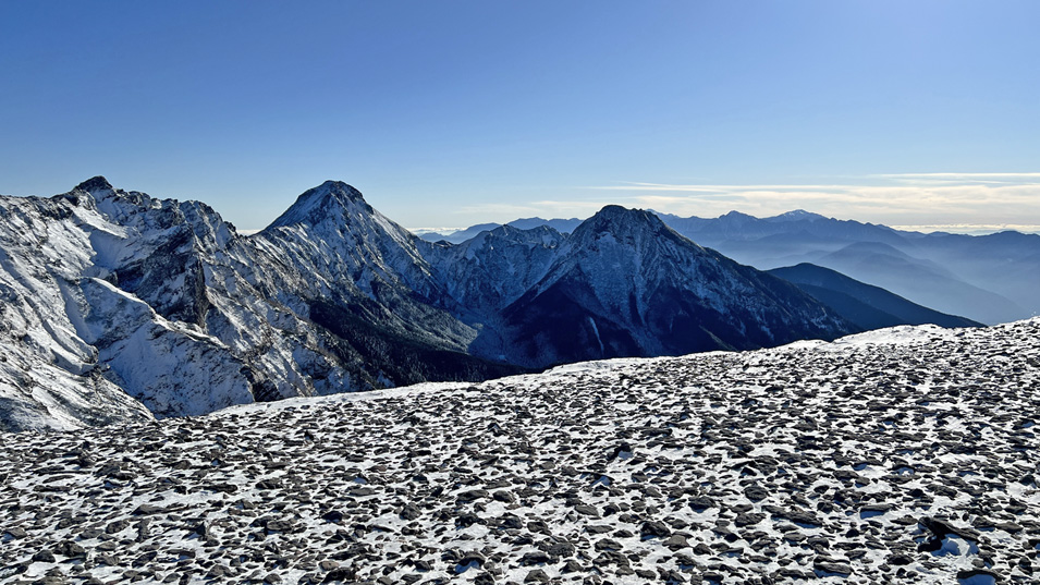 12/19 14:05 赤岳 硫黄岳山頂から横岳、赤岳、中岳、阿弥陀岳。後は北岳、甲斐駒、仙丈。