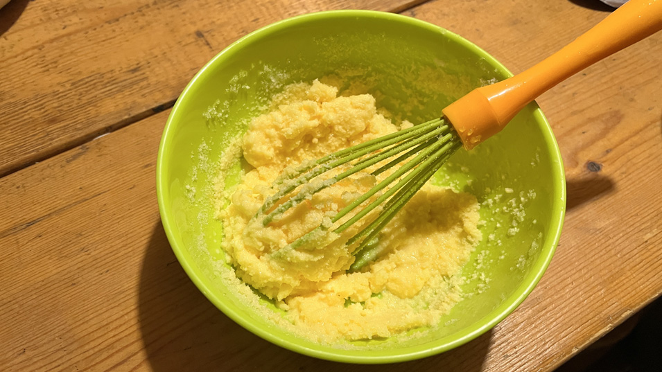 12/19 16:50 なんちゃってアイスクリーム 卵黄と練乳を攪拌し、奇麗な雪を適量混ぜるとバニラ味のシャーベットが完成。