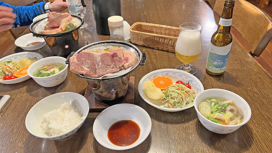 12/19 18:50 夕食 定刻10分前に夕食スタート。お楽しみの大きなステーキ、ポトフ、野菜サラダとフルーツ。