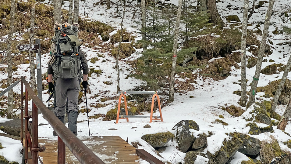 12/20 8:05 重装備 テント泊なのか大きなザックを背負ったアイスクライマー。