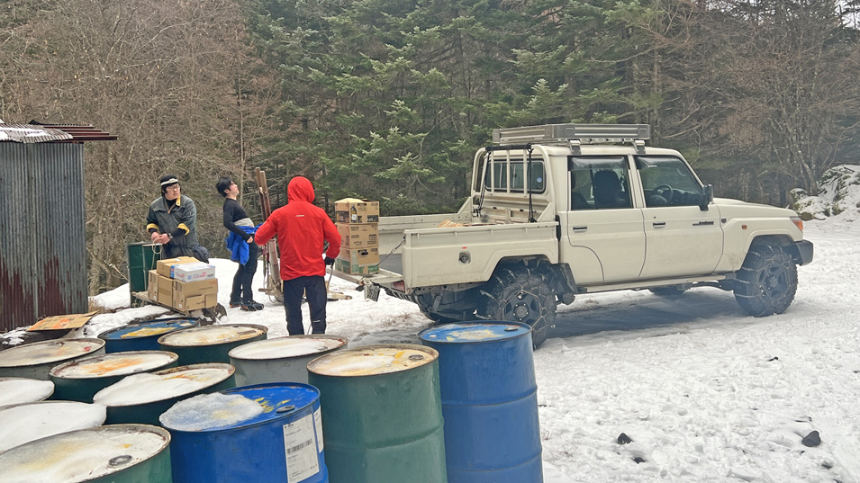 12/20 8:10 歩荷さん 赤岳鉱泉のスタッフが歩荷の準備をしていた。ランクルピックアップの荷台にあるダンボール箱3個はスタッフのクリスマスケーキ (6号)だそう。ランクルはなぜか品川ナンバーだった。