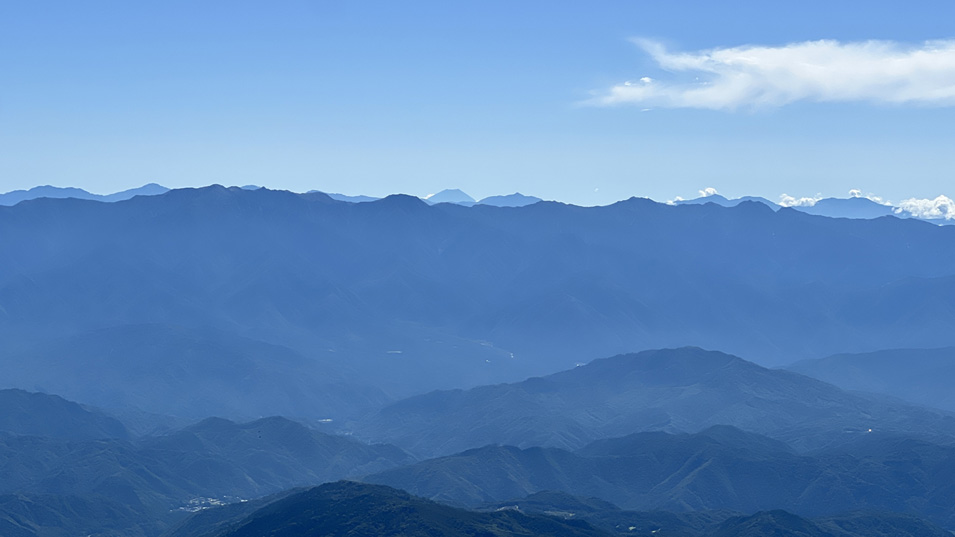 9/6 9:35 眺望 中央に富士山頂。右隣は塩見岳。左端は仙丈ヶ岳と北岳、右端は赤石岳。