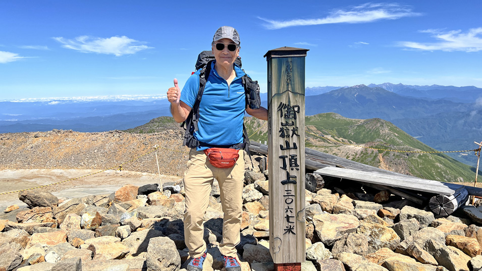9/6 10:30 剣ヶ峰 剣ヶ峰山頂の標識で記念撮影。1年ぶり5回目。噴火後は3回目だ。