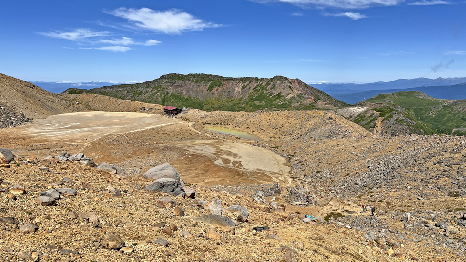 9/6 11:05 二ノ池 赤い屋根は二ノ池山荘。今夜の宿・二の池ヒュッテはその向こうにある。 地名は「ノ」で二ノ池山荘もカタカナだが、二の池ヒュッテはひらがななのだ。
