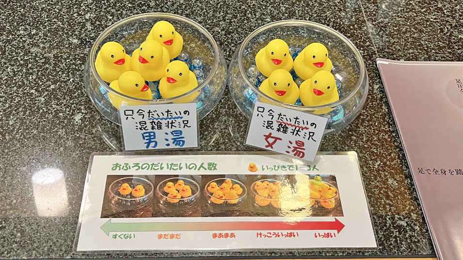 9/7 11:55 混雑状況 お風呂の混雑状況をアヒルの数で表現。男湯は「まあまあ」らしい。
