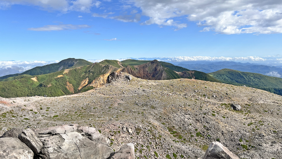9/19 8:30 噴火口 噴火口は直径50mと小さい。奥は朝日岳と三本鎗岳。
