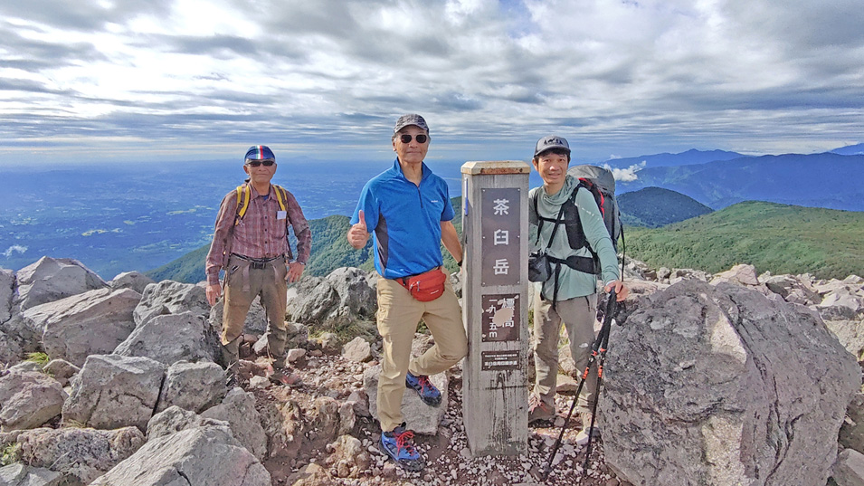 9/19 8:35 3ショット 山頂標識の前で記念撮影。気温15℃、ほぼ無風。