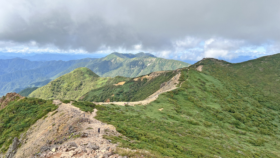9/19 10:50 朝日の肩 山頂から朝日の肩を見下ろす。後方はこれから辿る熊見曽根と隠居倉。さらに後方は三倉山。