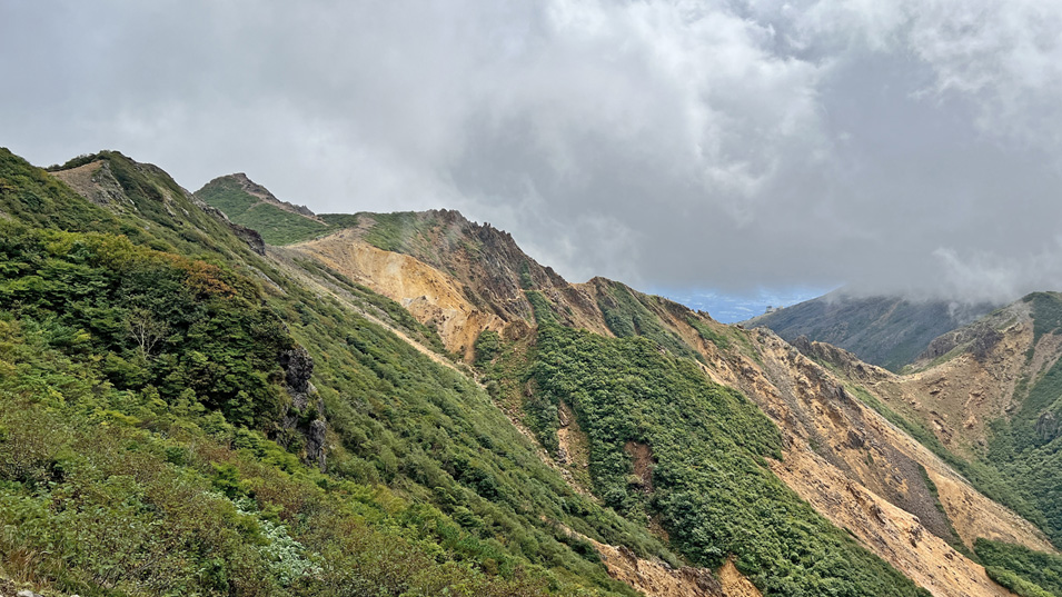9/19 11:30 朝日岳 熊見曽根から朝日岳。朝日岳のトラバースは横から見ると絶壁だ。