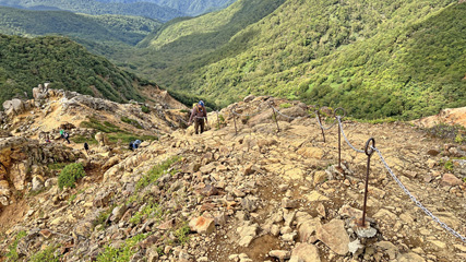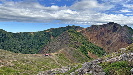 茶臼岳から朝日岳にかけての登山道が全部見える。