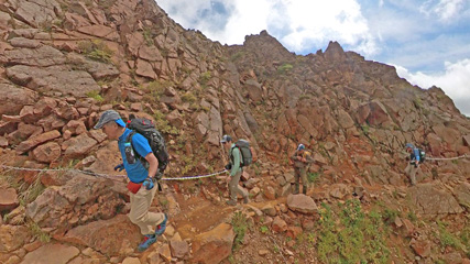 朝日岳を巻くトラバース。絶壁の狭い足場だが、落ちる気はしない。