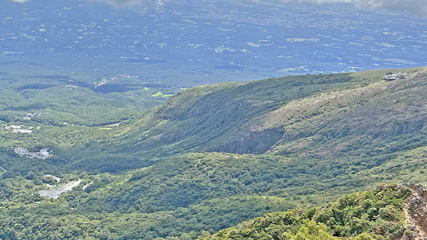 朝日岳山頂から峠の茶屋とロープウェイ。駐車場は満車のようだ。