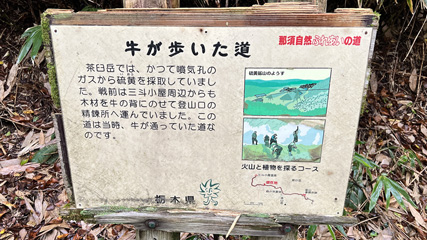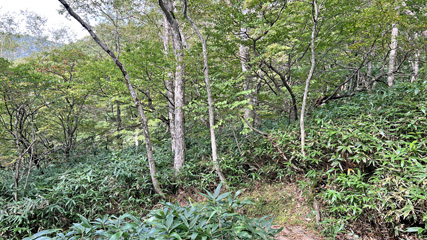 樹林帯の中、笹原を縫うように下る。三斗小屋温泉はもうすぐだ。