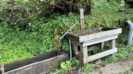 館内の洗面所の水は硫黄成分が多くて飲用不適なので、宿泊者の飲料水はこの水を使う。