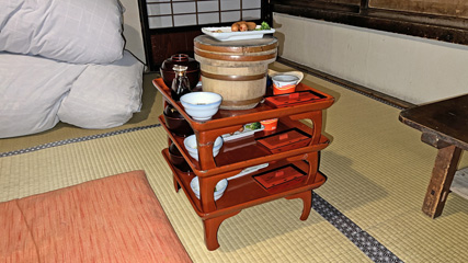 大黒屋の食事は部屋食。朱塗りのお膳で運ばれてくる。山小屋で部屋食なんて他では味わえない贅沢。