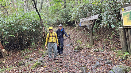 「三斗小屋温泉からここに登って行くには、たとえ健脚の人でもご隠居のように杖を突かないと登れないほどの急坂」というのが由来らしい。気温17℃。