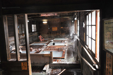 お風呂は1時間毎に男女入れ替え制。偶数時の男子は小さい方の「岩風呂」で定員4〜5人。まずはここに入る。
